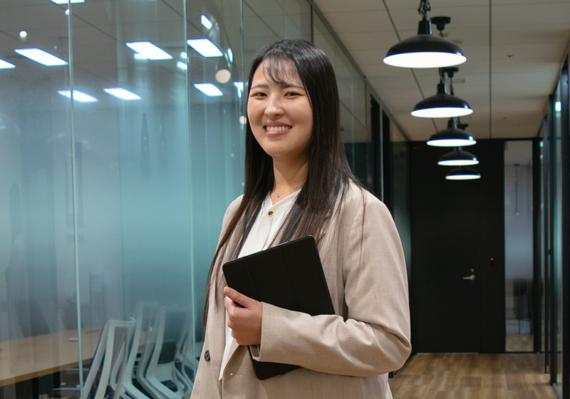 現在はAI関連のシステムを扱う企業で販促を担当していますが、大学で得た知識が想像以上に実践の場で役立っています。例えば、学んだ関数を使ってデータ集計を頼まれるといった直接的な場面もありますが、それ以上に大きいのは「エンジニアの言葉が分かる」ことです。営業と開発の間で交わされる専門的な会話にも臆することなく参加でき、時には両者の橋渡し役を担うこともあります。エンジニアの方から「このアプリ、どうすればもっと使いやすくなるかな?」と意見を求められることもあり、学びが信頼に繋がっていることを実感しています。