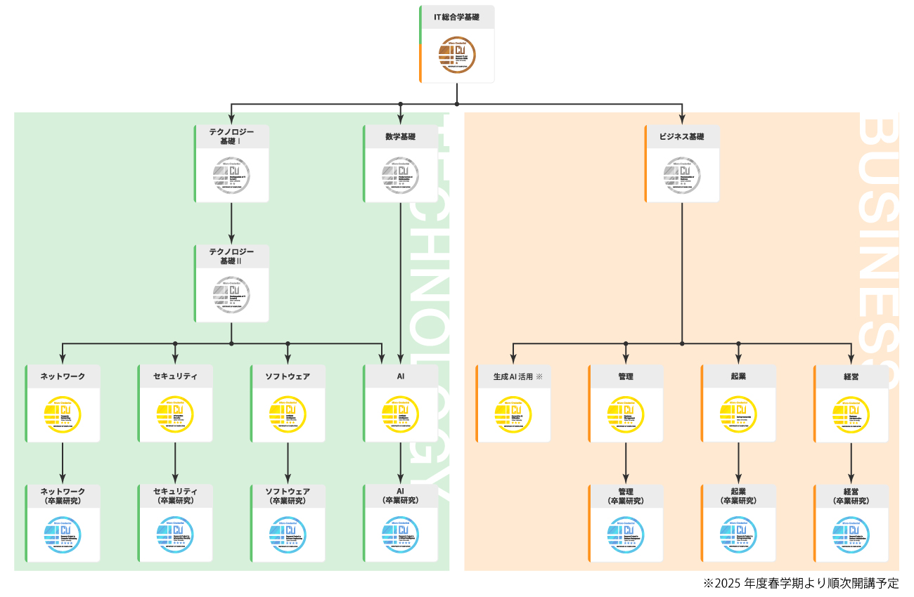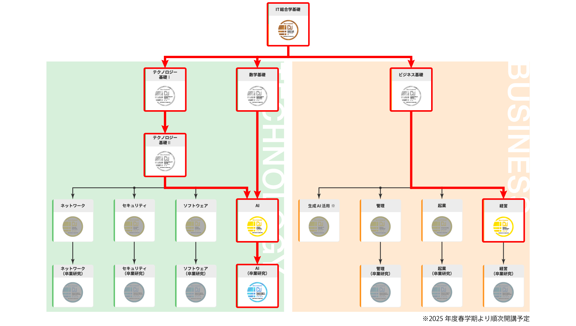 「IT総合学基礎」のブロンズバッジを取得後、次に専門分野の基礎固めとしてシルバーバッジの取得をめざします。IT、ビジネスそれぞれの分野別のゴールドバッジ、プラチナバッジをめざすためには、「テクノロジー基礎Ⅰ」「テクノロジー基礎Ⅱ」や「ビジネス基礎」等の該当する分野のシルバーバッジを取得する必要があります。テクノロジー系分野のなかでも特に、「AI」のゴールドバッジ、プラチナバッジをめざす場合は、「テクノロジー基礎Ⅰ」「テクノロジー基礎Ⅱ」のシルバーバッジに加え、「数学基礎」のシルバーバッジも取得する必要があります。「AI」のゴールドバッジを取得し、卒業研究科目の単位を修得することで「AI(卒業研究)」のプラチナバッジを取得することができます。