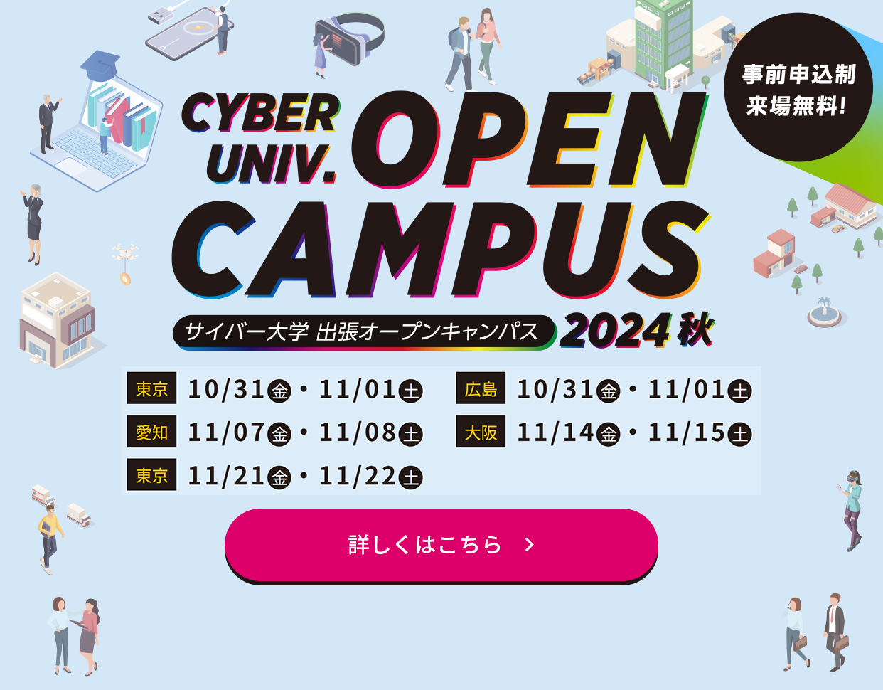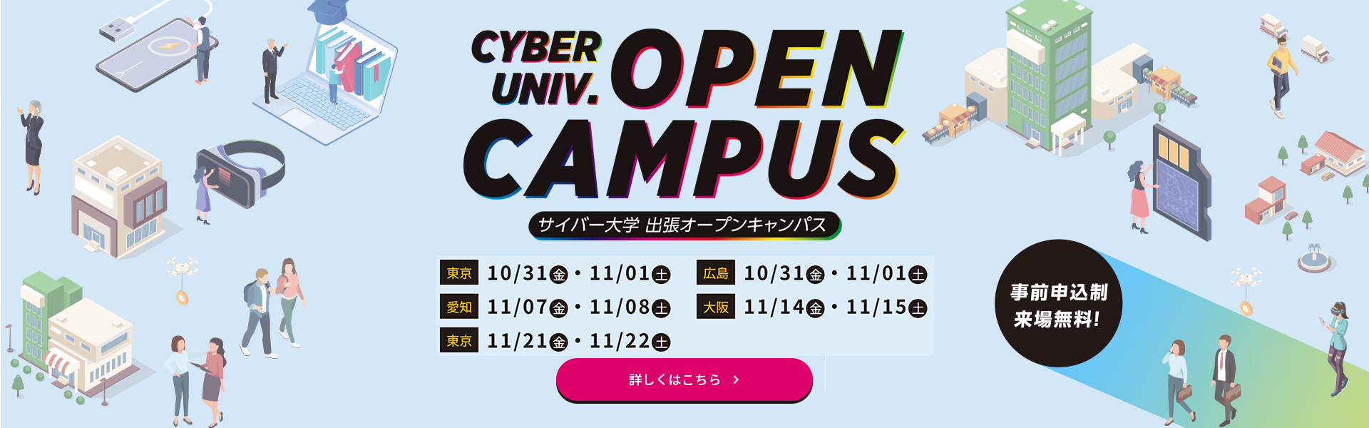 サイバー大学は、2025年10月から東京・広島・愛知・大阪の4都市で「出張オープンキャンパス」を開催します。 本イベントでは、大学紹介やカリキュラムの説明をはじめ、パンフレットでは伝えきれないリアルな学生生活について聞くことができる学生トークライブを実施する等、フルオンライン大学であるサイバー大学についてリアルに体験できる機会となっています。ぜひご参加ください。