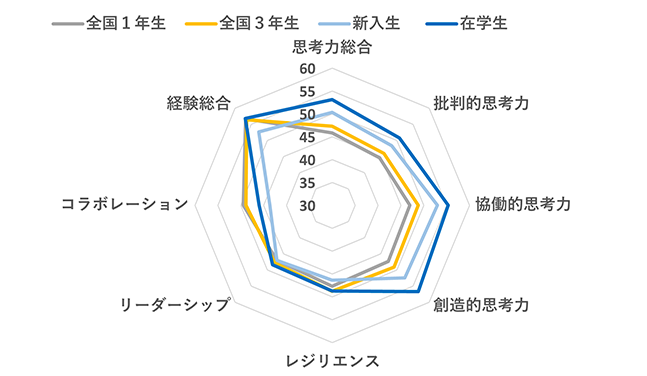 受検結果では、新入生・在学生ともに、「批判的思考力」、「協働的思考力」、「創造的思考力」が全受検者集計の平均を上回る結果になりました。特に在学生は、これらの項目で新入生を超えるスコアを示しており、「レジリエンス(ストレス耐性・回復力)」「リーダーシップ」「コラボレーション(共感性・外向性・親和性)」「経験総合」についても新入生より高い平均スコアとなっています。