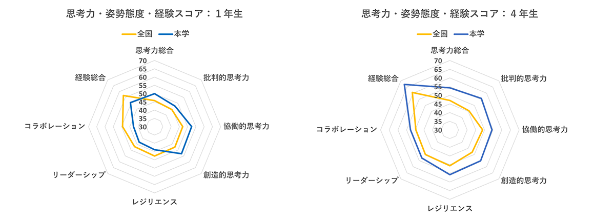 個別のデータを比較すると、姿勢態度の各要素(レジリエンス・リーダーシップ・コラボレーション)と経験総合のスコアは、1年次時点では全国の同学年より低いスコアであるものの、4年次には、それを上回るスコアとなっています。