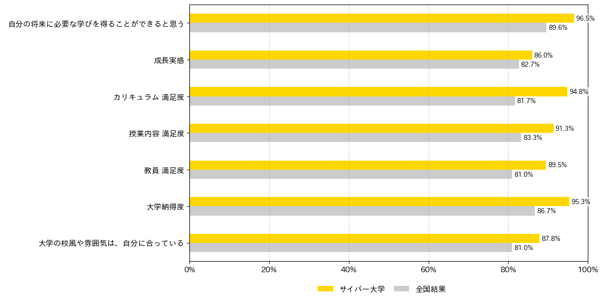 大学の魅力や教育への満足度を問うアンケートの結果、学生からは高い評価が寄せられています。新入生・在学生の95%以上が、自分の将来に必要な学びをこの大学で得られると回答しました。また、在学生を対象としたアンケートでは、85%を超える学生が、カリキュラムや授業、教員に満足していると答え、大学生活を通じて自身の成長を実感していることが明らかになりました。これらの結果は、学びの内容だけでなく、学生生活全体においても高い満足度と成長実感が得られていることを示しています。