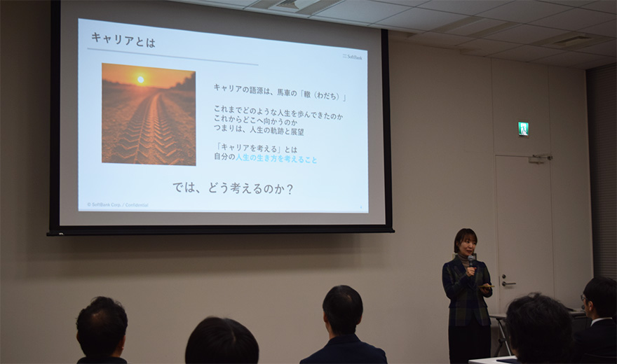 冒頭の学長挨拶後、グループ会社であるソフトバンクの採用担当の方が、最新の採用トレンドをテーマに登壇。職務内容を限定しない従来の「メンバーシップ型雇用」から、仕事に人を割り当てる「ジョブ型雇用」への移行等、現代社会が求める人材像や採用の動向等、今後のキャリア形成に役立つ知識を分かりやすく解説いただきました。