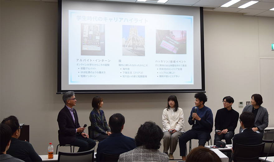 その後、本学の在学生・卒業生4人と経営・起業分野を専門とする馬場 研二 教授が登場。在学中の起業経験がある学生、長期インターンを経て職歴も評価され内定を獲得した学生、大手グローバル企業で活躍する学生等、学生の専門分野もキャリアの形もさまざまな4人ですが、共通して語っていたのは「まず行動してみることの大切さ」。経験談から、挑戦することがキャリア形成の第一歩であることが伝わりました。
