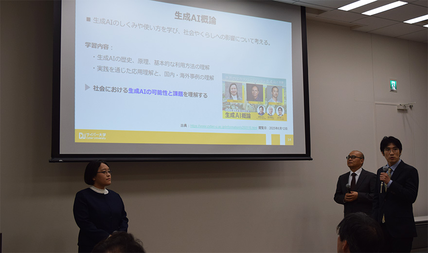 教員からは、人気の最新科目「生成AI概論」をはじめ、今後始まる生成AI活用やデジタルマーケティング分野の新科目を紹介。大学での学びや挑戦が、実社会での活躍に直結することを伝えました。