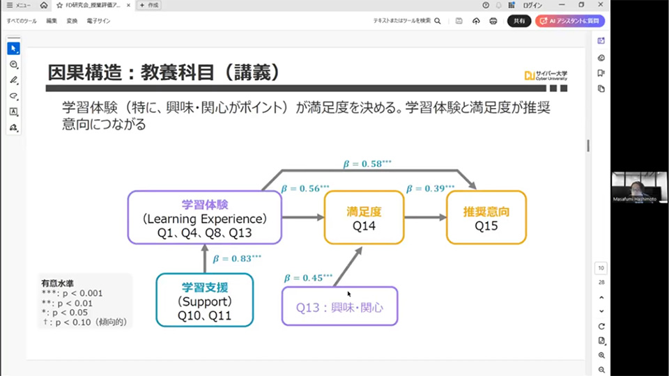 総括として安間学部長から、今回の客観的なデータ分析を今後の授業改善の確かな根拠として活用していく方針が述べられました。今後は分析結果に基づく具体的な改善策をベストプラクティスとして学内で共有し、さらなる教育の質向上につなげていくことが確認されました。