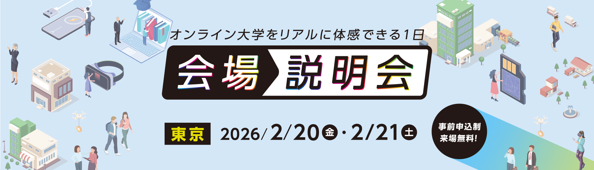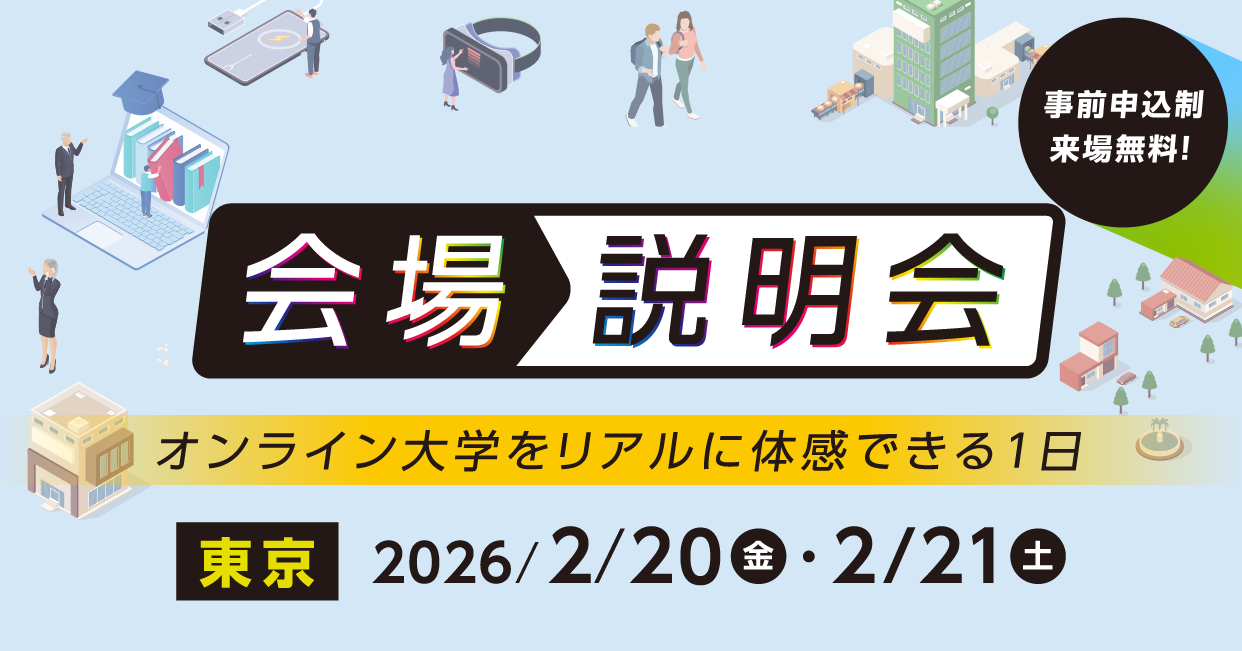 ご要望にお応えし、2月も会場説明会を実施します。 サイバー大学の学びや入学制度を、会場でじっくり確認できる説明会です。 オンライン大学ならではの学修スタイルやカリキュラム、学費・奨学金制度、入学までの流れについて、担当スタッフが分かりやすくご説明します。気になる点をその場で確認できるため、入学検討を具体的に進めたい方にお勧めです。