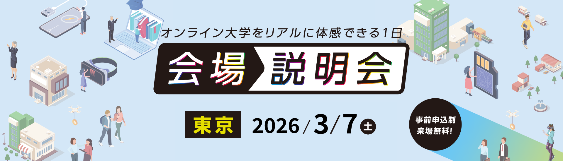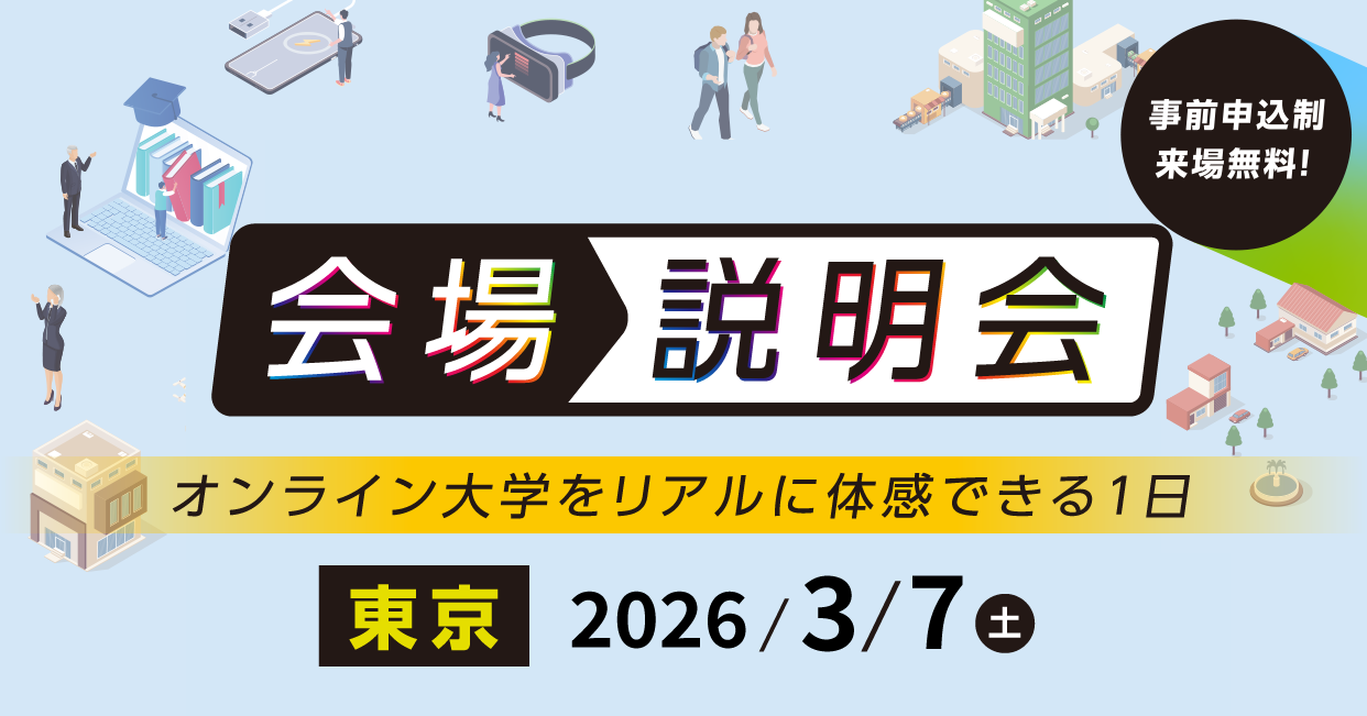 ご要望にお応えし、追加で会場説明会を実施します。 サイバー大学の学びや入学制度を、会場でじっくり確認できる説明会です。 オンライン大学ならではの学修スタイルやカリキュラム、学費・奨学金制度、入学までの流れについて、担当スタッフが分かりやすくご説明します。気になる点をその場で確認できるため、入学検討を具体的に進めたい方にお勧めです。